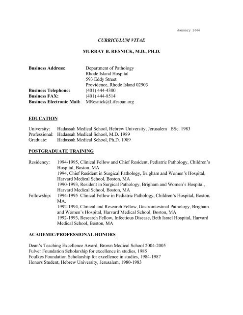 Curriculum Vitae Murray B Resnick Md Ph D Research Brown